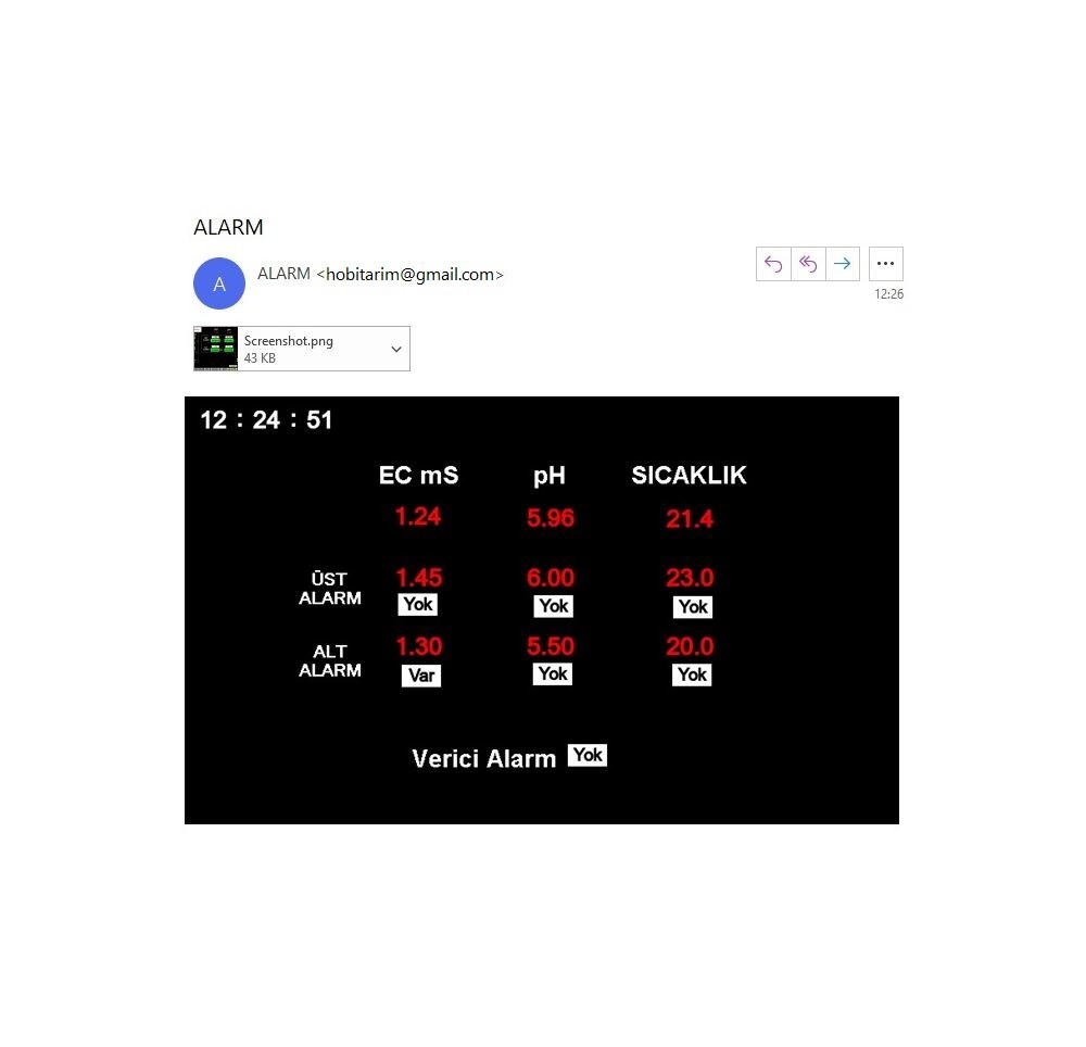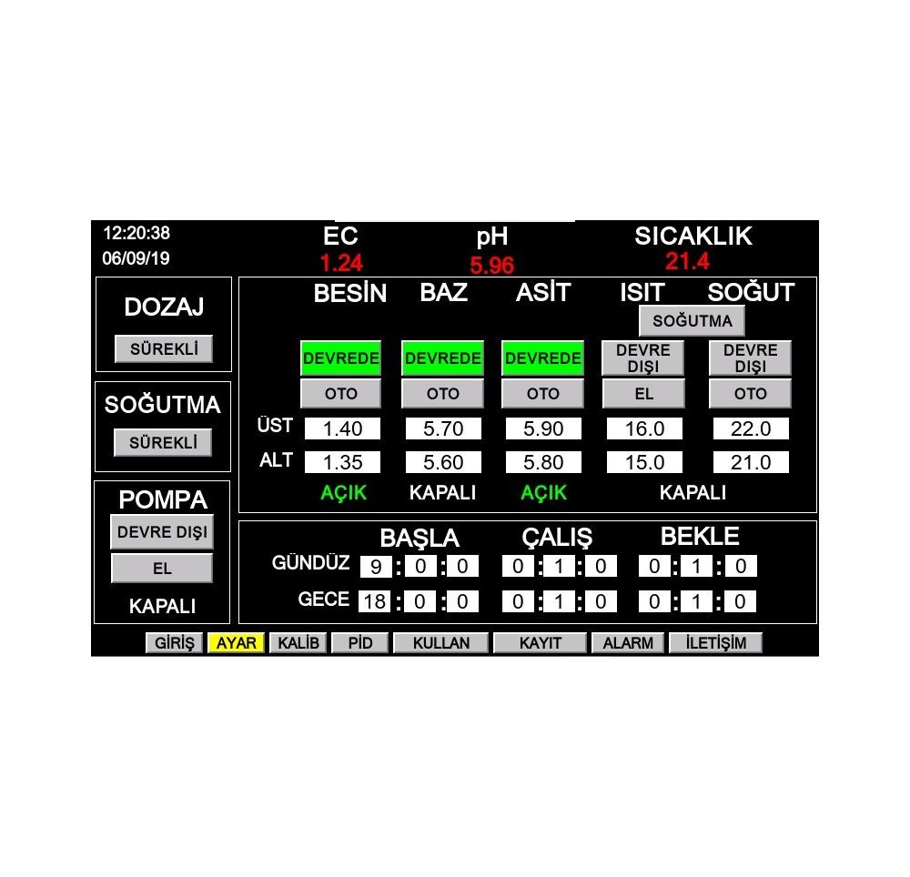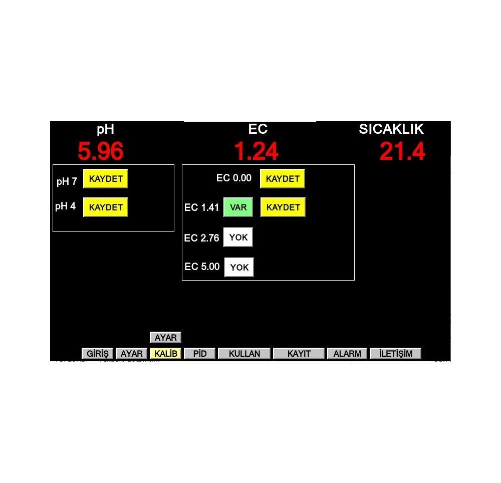 Ph Ec Dozlama ve Su sıcaklığı Kontrol Sistemi, Cihaz; EC, pH, su sıcaklığı ölçüm sensörleri ile ana depo veya pompa çıkış borusu içerisinden ölçümleri yaparak istenilen ayar değerlerine göre besin, asit, baz pompalarını çalıştırır ve ısıtıcı veya soğutucuyu kontrol eder. Su pompasının zamana bağlı çalışmasını sağlar. Alarm durumlarında sesli-ışıklı ikaz verir ve e-posta gönderir. 7” dokunmatik renkli ekranı bulunmaktadır. Bilgisayar, tablet ve telefonunuzdan cihaza internet üzerinden ulaşarak bütün fonksiyonlarını kullanabilirsiniz.